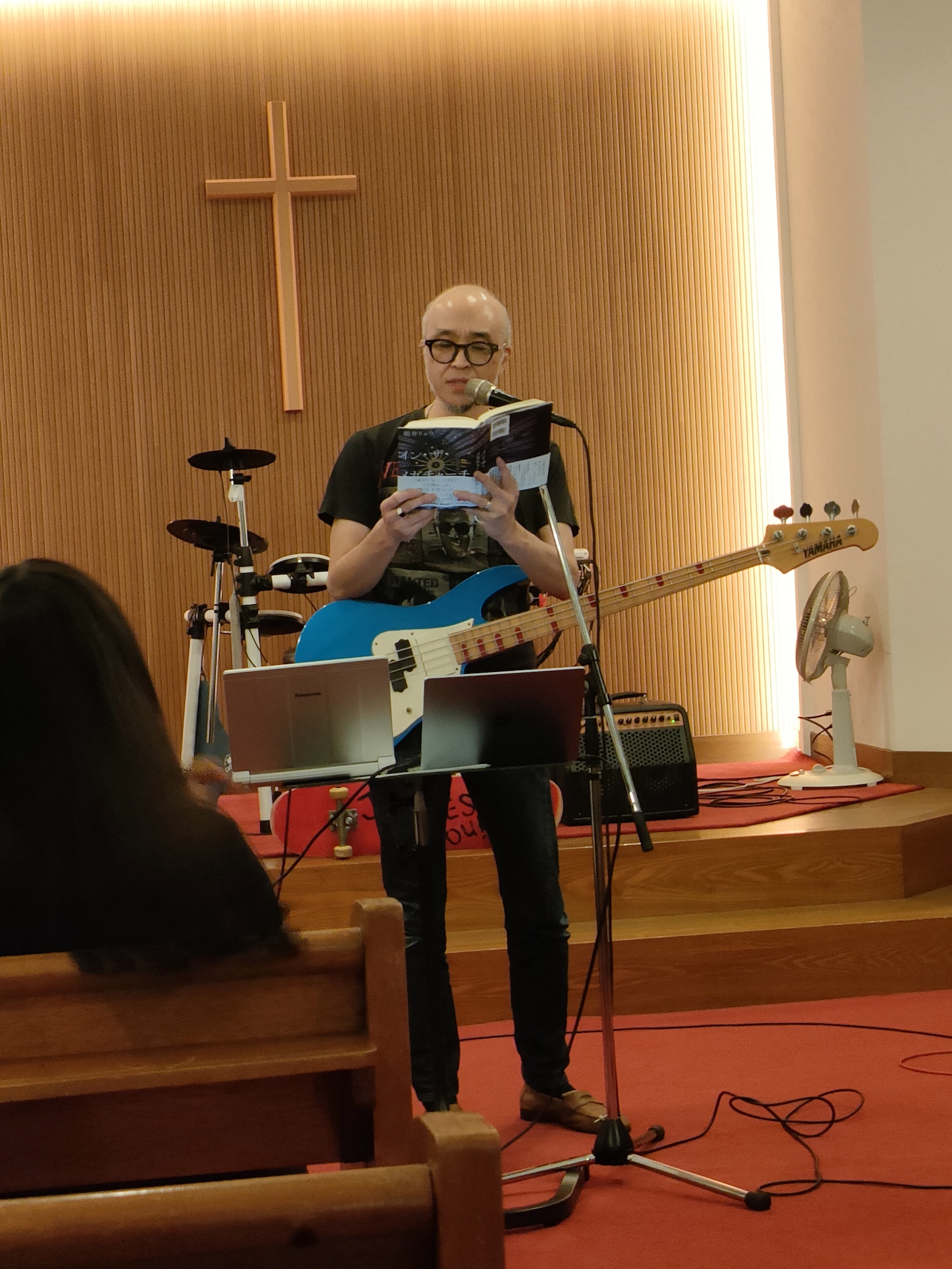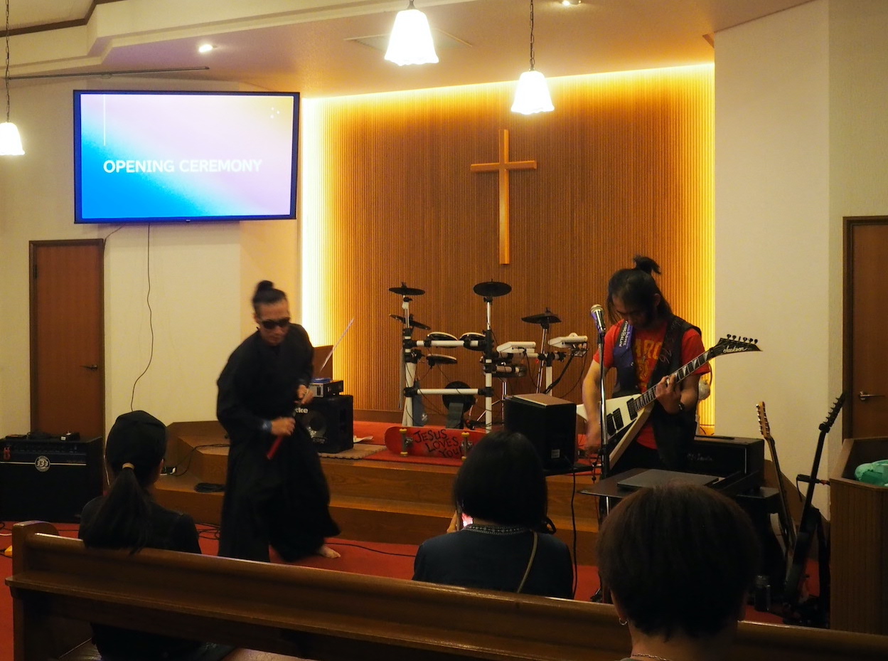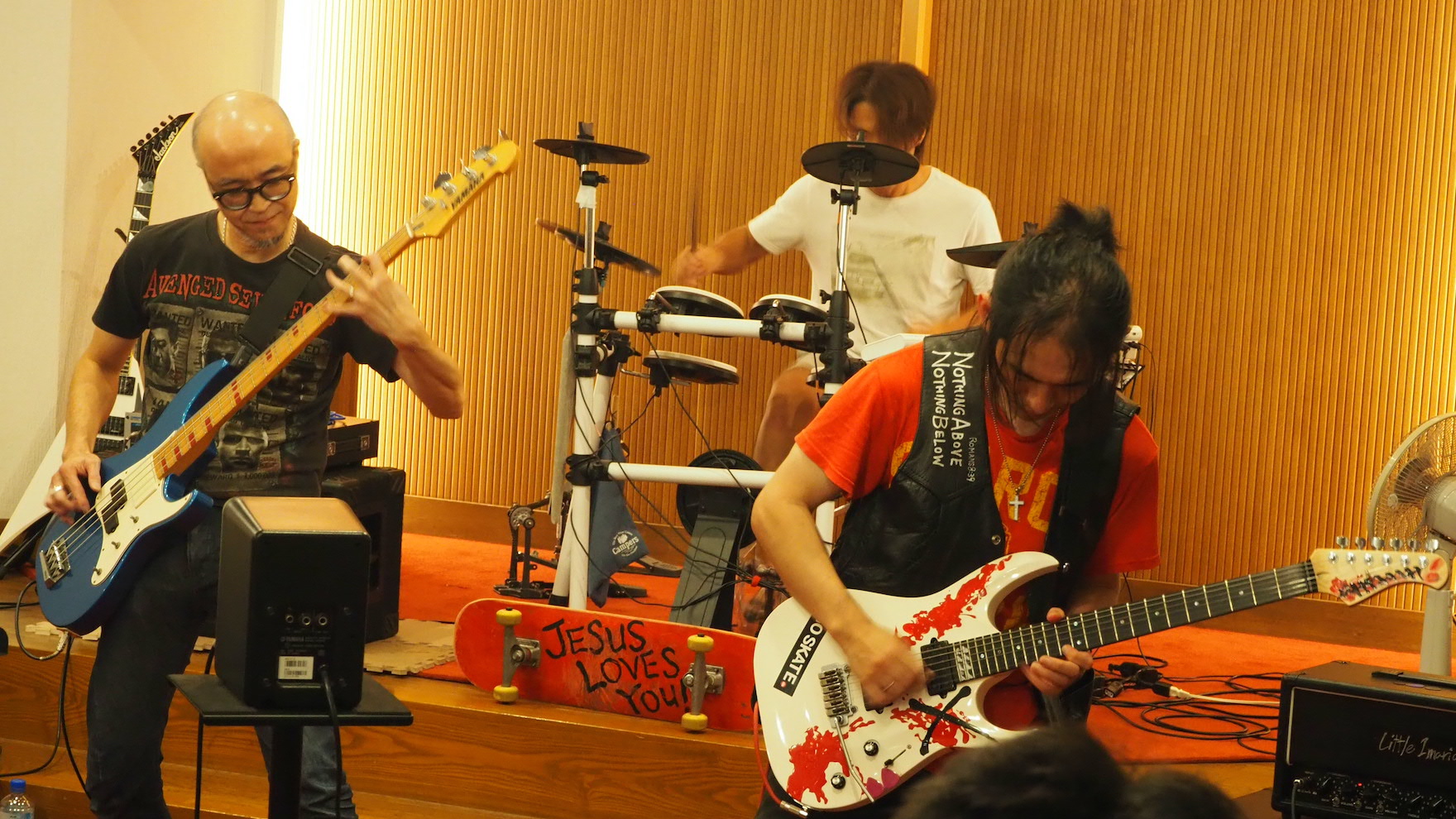 荻野牧師のメッセージの中で、ワーシップチームによってもう1曲、SlayerのWar Ensembleが演奏されました。仮にも教会の礼拝という場において、Slayerを演奏するというのは過激なチョイスと言えます。しかし、反戦のメッセージというだけでなく、平和への祈りという説教のテーマに関連する題材として演奏されました。(もちろん、荻野牧師がスラッシュメタルが大好きだという事も理由のひとつです)