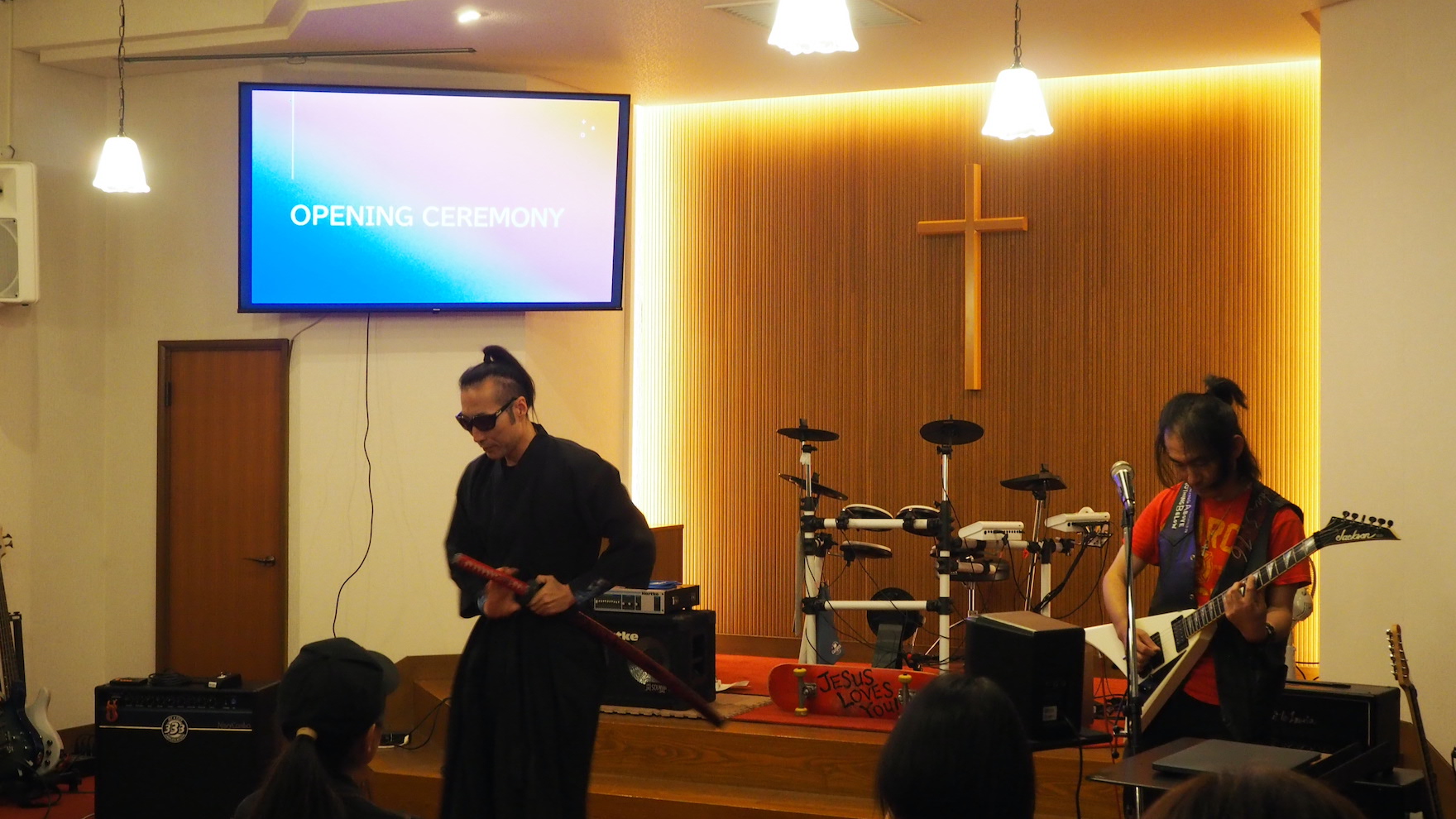 オープニングセレモニーとして、Imari Tonesの先代のドラマーであり、今もって良き友人であるところのShinryuが抜刀のパフォーマンスを披露してくれました。(Toneのギター伴奏でShinryuが抜刀パフォーマンスを行うのは一年数ヶ月ぶりでした) Shinryuは、“Christian Samurai”を名乗り、今年もアメリカで活躍した他、いくつものバンドで演奏し、日本のクリスチャンおよびファンクロックの伝説的バンドであるB.D.Badgeのドラマーとしても活動しています。