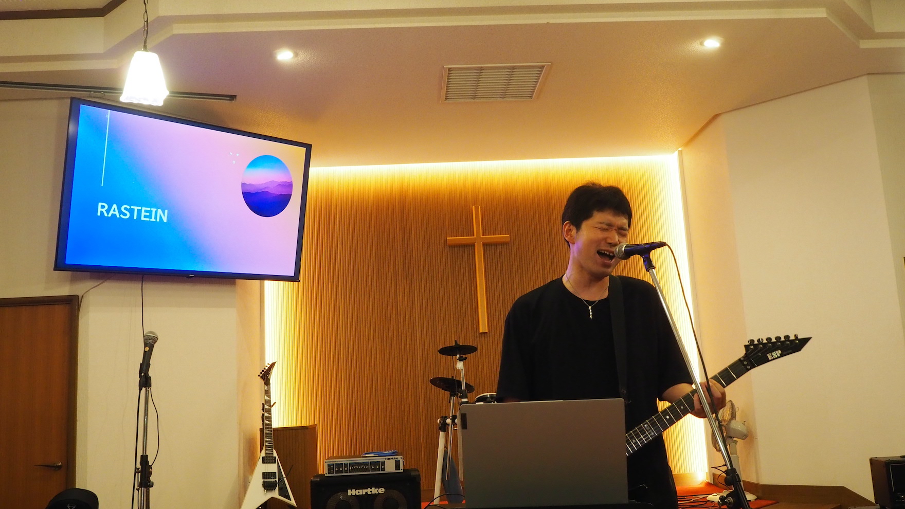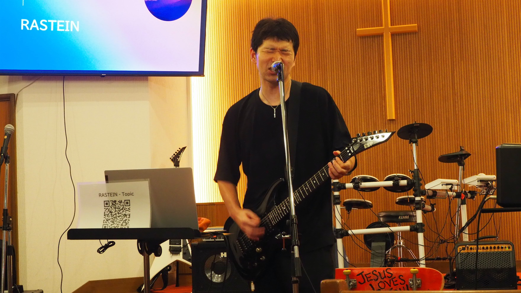 クリスチャン関係者だけでなく、一般のメタルアクトにもご参加いただきたいという願いから、主催者のつながりでお呼びしたRASTEINさん。今回のイベントで唯一、いわゆる「ノンクリスチャン」のアーティストです。ソロ演奏ではありますが、レベルの高いヘヴィメタルの演奏だけでなく、歌詞やメッセージ性が興味深く、好評を得ていました。(主催者としては、イベントのカラーに合致するのではないかと考えていましたが、予想以上に好評で喜ばしく思いました)