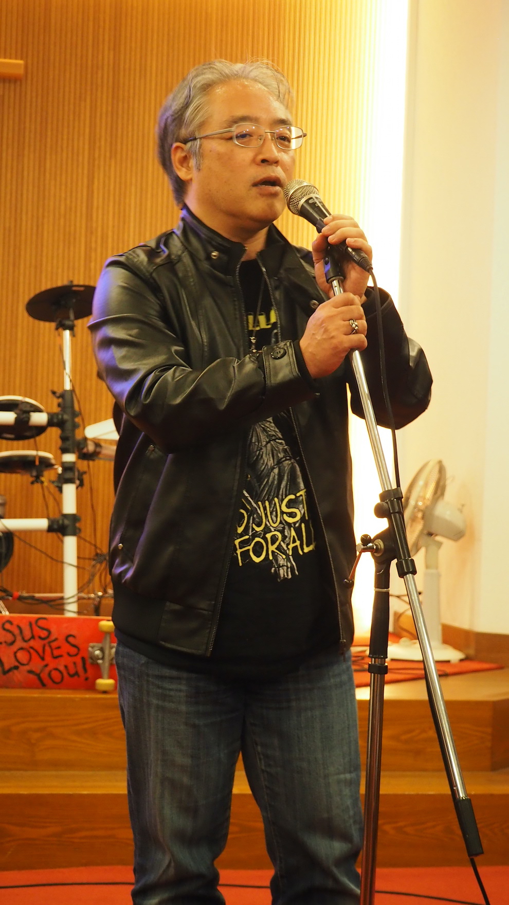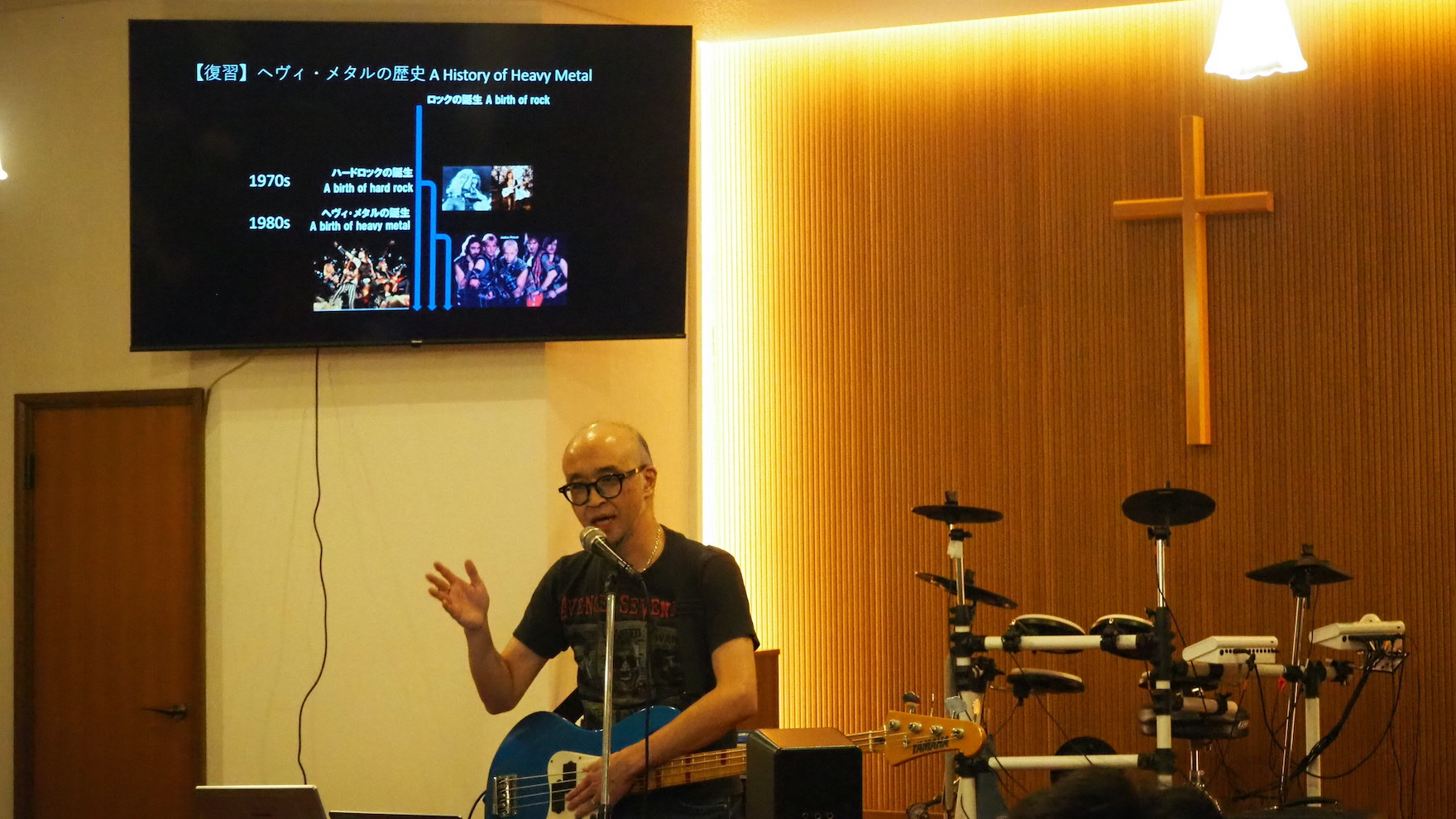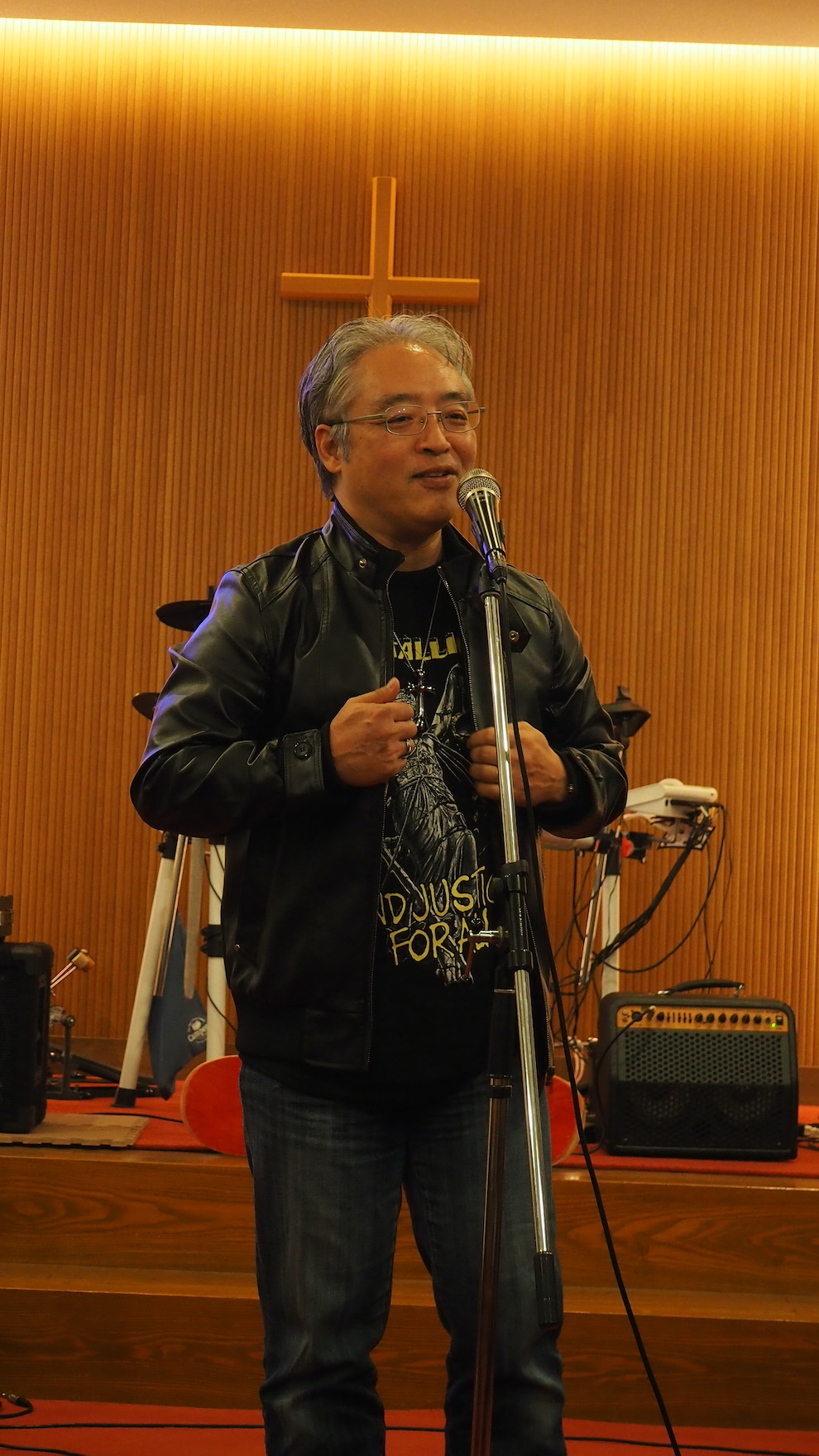 このヘヴィメタルチャーチにおいては「メタルヘッド牧師」として通っている荻野倫夫牧師。荻野”メタルヘッド”倫夫牧師です。ヘヴィメタルの歴史を踏まえた「メタル説教」をしていただきました。そして集まった人々と共にエルサレムの平和のために祈りました。
